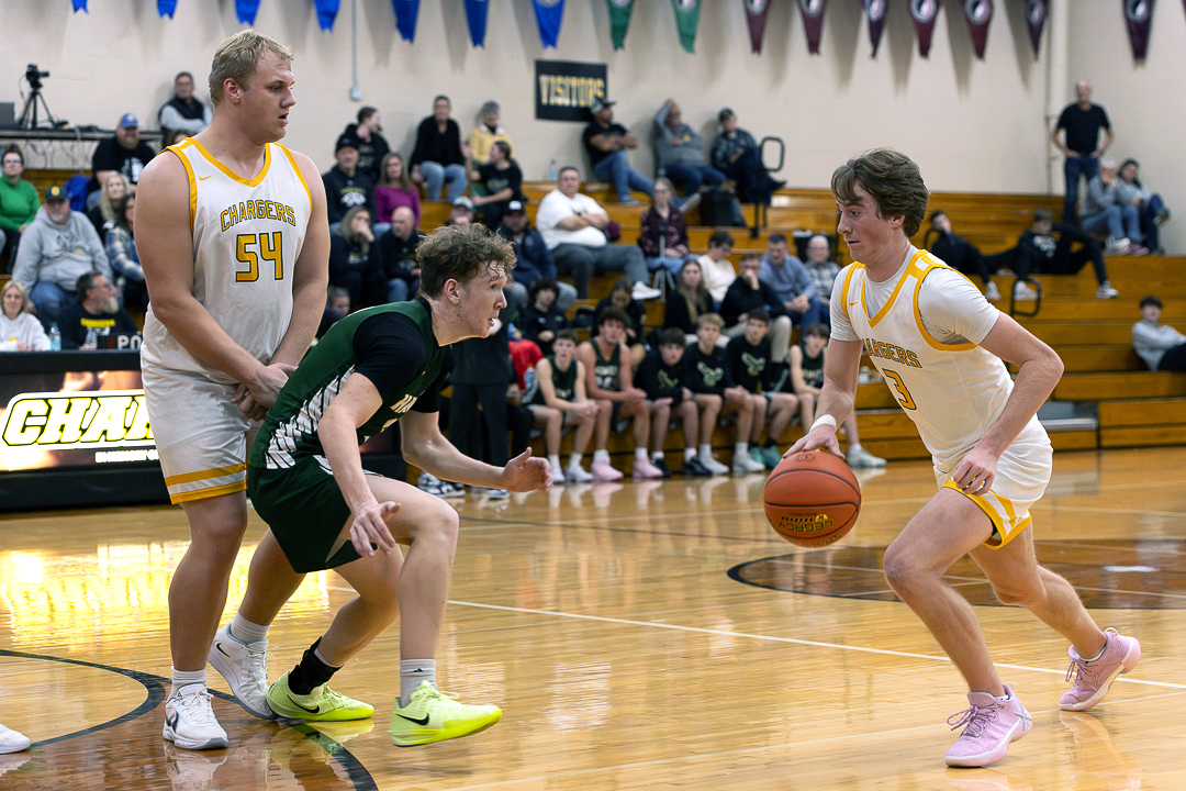 PICTURED: No. 54 Mason Wahl sets the pick for No. 3 Jathan South against Woodward-Granger on Dec. 6. Photo by Mark Reno | |