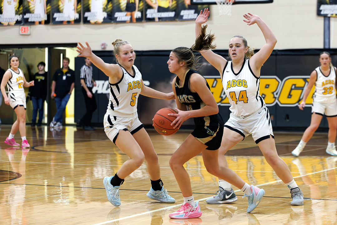 PICTURED: No. 5 Meranda Gruber and No. 44 Olivia Mahaffey set the trap during ACGC's press against Woodward-Granger on Dec. 5. Photo by Mark Reno | |