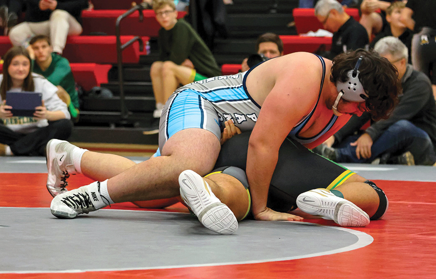 PICTURED: Joel Cooper (285) has control over his opponent during the Treynor Wrestling Invite on Dec. 7. Photo by Betty Cooper | |