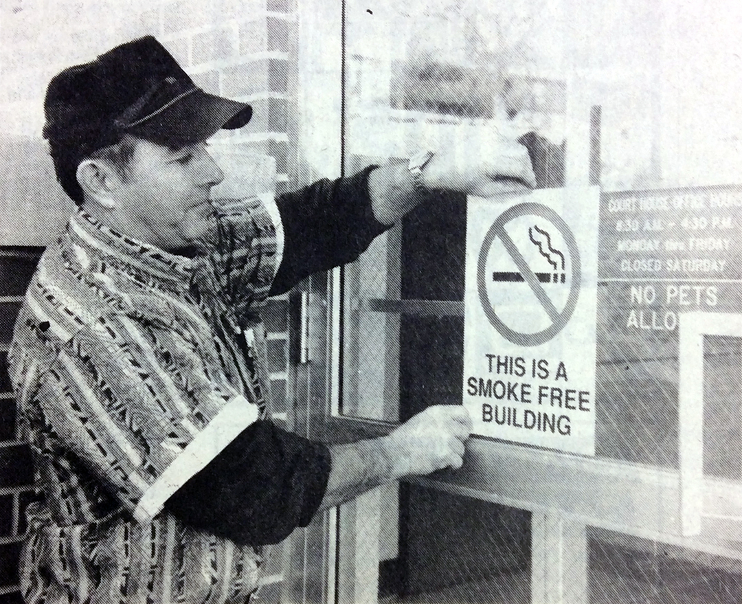 SMOKE-FREE. Dean Downing, a custodian at the Guthrie County Courthouse, installs a no smoking sign at one of the courthouse's five entrances. The building officially became smoke-free Monday. Previously, smoking was allowed in the building's hallways and bathrooms.
