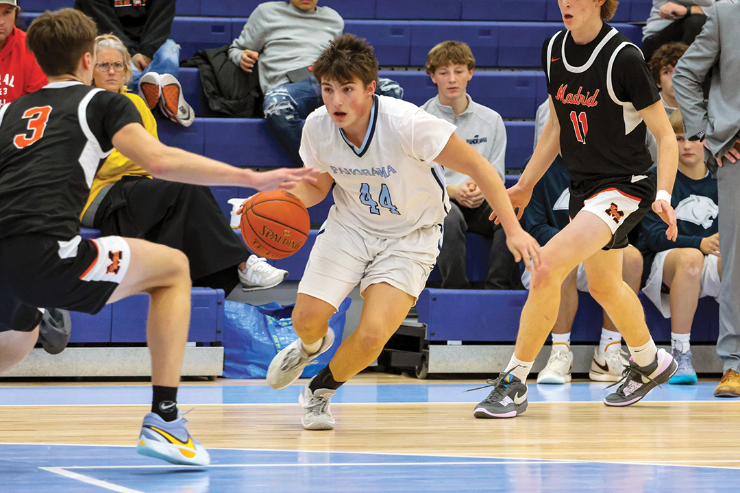PICTURED: Panorama's No. 44 Brayden Galvan splits the double team against Madrid. Photo by Betty Cooper
