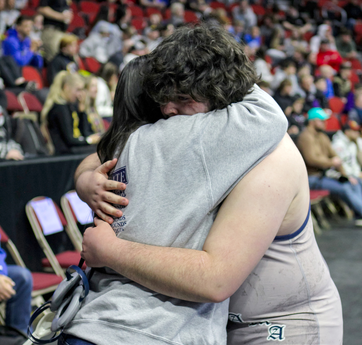 Betty is pictured here giving and receiving a big hug from Joel after his last match at Wells Fargo Arena.