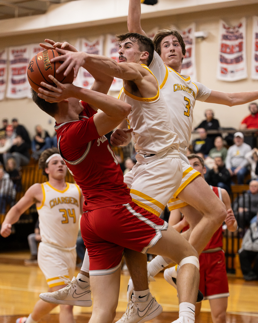 PICTURED: No. 2 Joe Crawford and No. 3 Jathan South rise up to protect the rim against Audubon on Thursday, Feb. 20. Photo by Mark Reno | | | | | | | | See more photos | |
