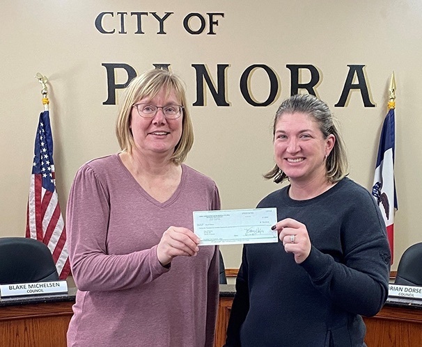 Chris Arganbright of the Bryton Insurance Agency in Panora delivered a $26,676 check to City of Panora Administrator Lisa Grossman. This is an Iowa Association of Municipal Utilities (IAMU) safety group dividend paid back by participating in the EMC Insurance Companies insurance program for cities. Total dividends returned to participating municipal utilities for 2024 were $7.3 million. The IAMU insurance program is in its 41st year. It is unique in that it returns money to its members for their diligent efforts in safety and reducing losses. | |