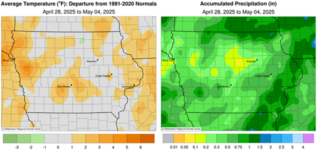 “Farmers in some parts of the state have been dealing with wet field conditions after a rainy end to April. The first few days of May have been more favorable for farmers to get back into the fields,” Secretary Naig said. “With the next week or two looking generally warmer and drier, conditions should allow for farmers to make significant planting progress.”