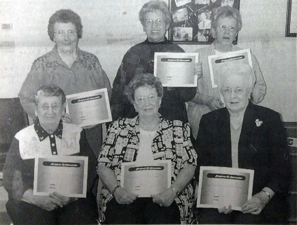 HOSPITAL CONTRIBUTIONS. Recognized for their contribution to the hospital are, in front, Evelyn Downing, Bea Millhollin and Darlene Stringham. Back row: Doris Jorgensen, Ina Kness and Kathleen Mains.