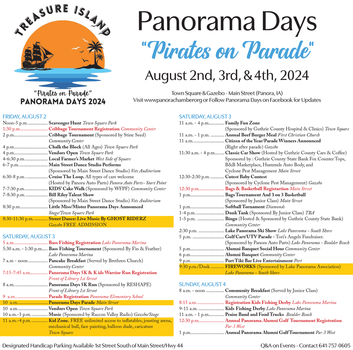 The annual three-day Panorama Days celebration that covers Panora and Lake Panorama begins Friday, Aug. 2 and runs through Sunday, Aug. 4. The theme for 2024 is “Treasure Island — Pirates on Parade.”