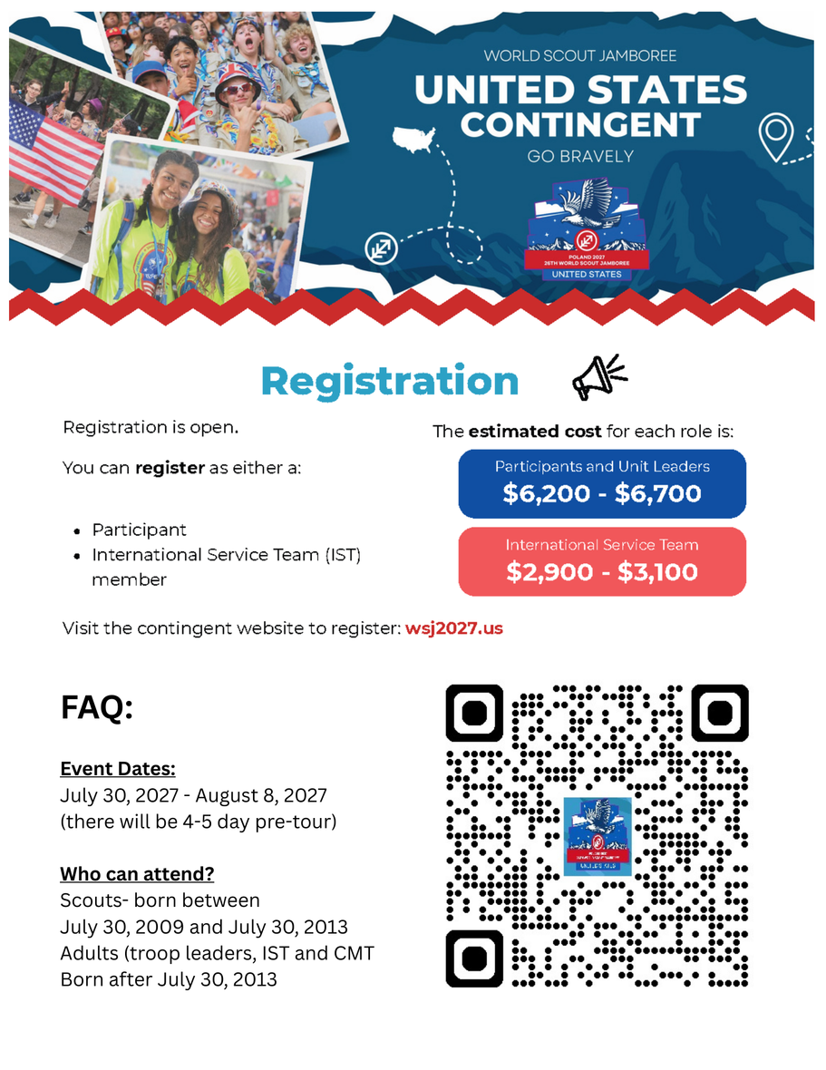 Registration is open for the 2027 World Scout Jamboree in Poland! Please share this graphic and website with your Council communications team for publishing in their newsletter, social media, and other communication channels.