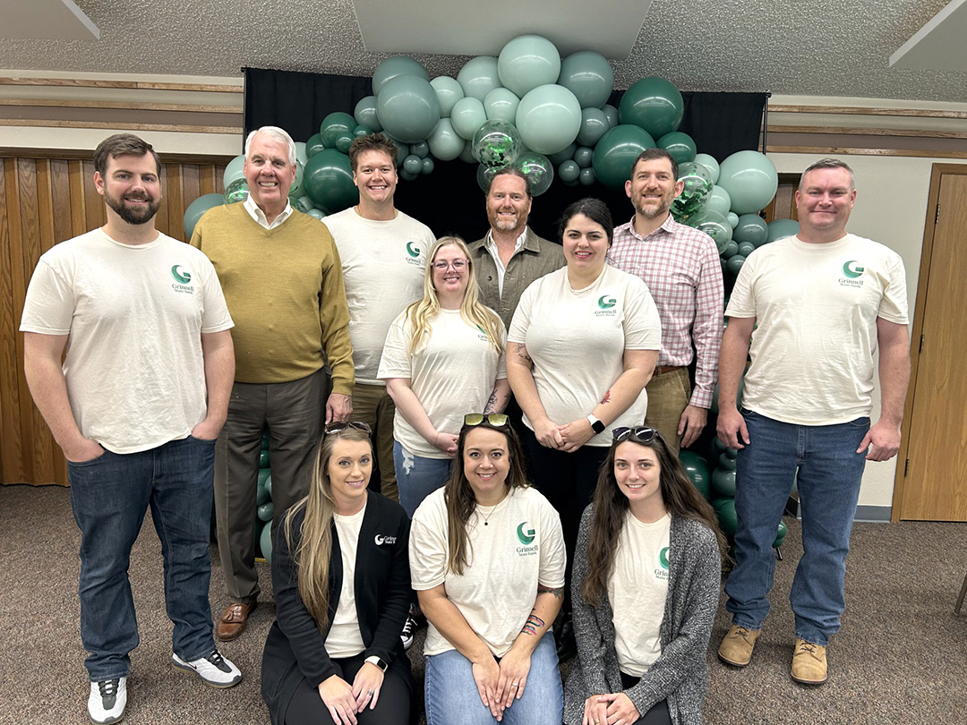 Grinnell State Bank held a 100-Year Celebration Oct. 23. Front row: Mollie Ehlert, Caitlyn Fisher, Erika Van Sickle; second row: Brianna Christianson, Reyna Myott; and, back row: Matthew Formanek, John Smith, Carson Jones, Rusty Jones, Kyle Wilcox and Adam Rinehart.
